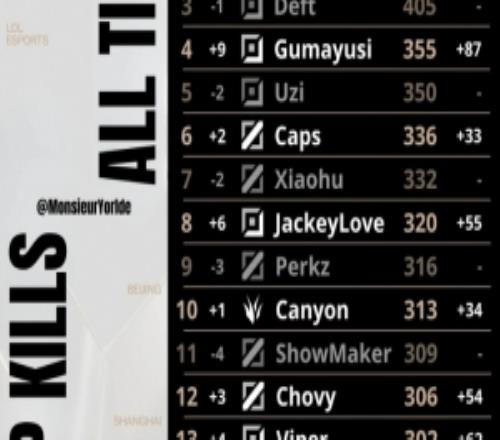 体育资讯11月1日称 外媒统计全球总决赛总击杀数榜单,具体如下:
